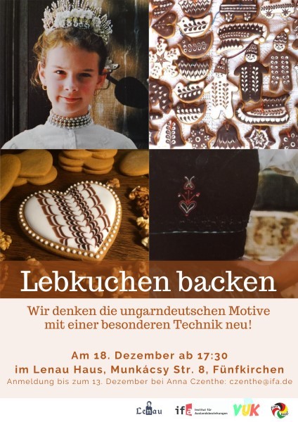 - 18. Dezember ab 17:30 "Lebkuchen backen". Wir denken die ungarndeutschen Motive mit einer besonderen Technik neu, inspiriert vom Trachtenbuch von Helmut Heil. Anmeldung: bis 13. Dezember auf: czenthe@ifa.de. Die Anmeldung ist erforderlich um genügend Zutaten einzukaufen. Facebook-Veranstaltung: https://www.facebook.com/