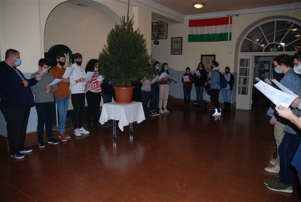 Adventi reggeli éneklés, zenélés Adventben szerda reggeleken az iskola énekkara, zenei együttesei énekelnek, zenélnek a Nagy Lajos szobornál. 2021.12.01
