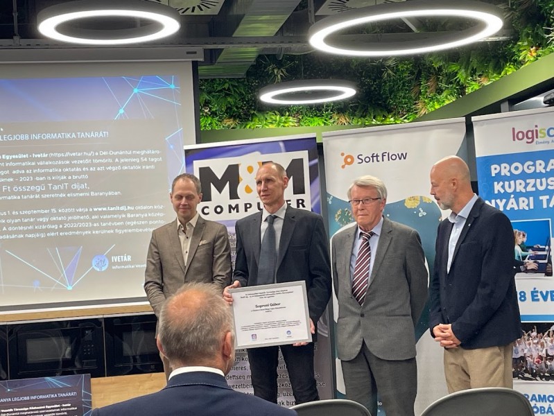 Elismerés a legjobb informatikatanárnak - az Informatikai Vezetők Társasága (Ivetár) a kamara együttműködésével és támogatásával idén is odaítélte a TanIT díjat, amit minden évben a legkiemelkedőbb baranyai informatikatanár kap. Az idei évben Soproni Gábor nyerte el a díjat, melyet dr. Dobay Péter, Kristóf Péter (Ivetár elnöke) és Zalay Buda (kamarai ICT bizottság elnöke) adott át.